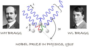 Sir William Henry Bragg (1862–1942) and Sir William Lawrence Bragg (1890–1971). Father and son. Showed how x-ray diffraction from crystals can be used to determine the structure of crystals.