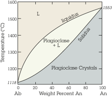 Phases in the two-component system albite–anorthite at 1 atm. The phase diagram was originally determined in 1913 from experiments conducted by N. L. Bowen