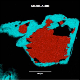 Nanoscale isotope and chemical images of grains of Amelia albite that were reacted with 2 M 18O-enriched solution of KCl show a correspondence between O-isotope exchange and K–Na exchange. Experiments were conducted for 4–6 d at 600 °C and 200 MPa. After 6 d, the 150 μm diameter albite grains had 5–20 μm rims in which Na was nearly completely replaced by K and in which the O was strongly enriched in 18O. The boundary between the core albite and the K-feldspar replacement is sharp and decorated with numerous pores. The distribution of Na and K, determined by electron probe microanalysis, is uniform within the core and rim and has an abrupt discontinuity at the interface. There is no evidence for K–Na interdiffusion at the resolution of electron probe. The NanoSIMS shows that the interface is also sharp in the distribution of 18O and 16O. The NanoSIMS image data and the electron probe data were coregistered; principal components analysis of the merged data set shows that 86% of the total variance in the data result from a single principal component loaded by the replacement of Na by K and 18O. The combined electron probe and NanoSIMS analyses indicate that both cation and isotope exchange occurred during solution and reprecipitation of the feldspar.