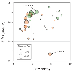 Three rock units near the head of Wildrose Canyon have assemblages that indicate distinct fluid compositions. These are the Late Precambrian Kingston Peak Formation, the Noonday Dolomite, and the Johnnie Formation. The Kingston Peak Formation contains a variety of rock types, mostly argillite, graywacke, and conglomerate. Assemblages in the argillite indicate a very water-rich environment. The Noonday Dolomite reacted with a carbonated fluid, and the Johnnie Formation shows evidence for a fluid that changed composition from carbonated to water-rich during metamorphism. Peter Souza measured the C and O isotopic composition of the top part of the Noonday Dolomite. The graph on the left shows the composition at different stratigraphic levels. The top of the formation originally had a high value of δ13C; whereas the lower part had an original value of ~0. During metamorphism, both the C and the O decreased in delta value as a result of the influx of an isotopically light fluid, possibly from the Kingston Peak Formation, beneath.