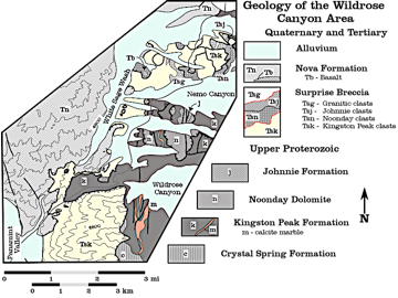 The metamorphic terrain in the Panamint Mountains, California, was developed in Late Precambrian sedimentary rocks during Mesozoic time, contemporaneous with emplacement of the Sierra Nevada batholith. The metamorphism is characterized by the presence of andalusite and cordierite in pelitic rocks, an assemblage that formed in a low-pressure, high-temperature metamorphic environment. I am now determining the petrogenesis of the rocks in Wildrose Canyon, which includes calcic schist in the Kingston Peak Formation, dolomitic marble in the Noonday Dolomite, and pelitic schist in the Johnnie Formation. Peter Nabelek and I are determining the stable isotope compositions of carbonate rocks and combining the results with petrologic information to determine the relation between fluid transport and metamorphism during batholith emplacement. A description of the geology of the Telescope Peak Quadrangle was given by